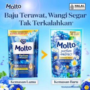 Molto ALL IN ONE CAIRAN PEWANGI BAJU Satu-satunya pelembut baju refill yang mengandung teknologi ULTRA CARE Cairan pelembut baju yang menjaga bentuk, warna, dan kelembutan pakaian Cairan pewangi pakaian yang tahan lama hingga 14 hari Softener Konsentrat yang mengurangi kusut pada pakaian Cairan baju yang mengurangi munculnya serabut – KEMENKES RI PKD 20203022489Molto ALL IN ONE CAIRAN PEWANGI BAJU BLUE – NEW AND IMPROVED! Molto All in 1 cairan pewangi baju konsentrat sekali bilas tidak hanya memberikan wangi tahan lama yang Anda cintai, kini mengandung teknologi ULTRA CARE yang melapisi dan memperkuat pakaian hingga serat kain terdalam, melindungi pakaian dari warna pudar & kerusakan bentuk pakaian. Menjaganya tetap cantik bahkan setelah dicuci berulang kali.Molto adalah brand pelembut dan pewangi pertama di Indonesia dan tim research and development kami tidak pernah berhenti mencari inovasi untuk menghasilkan produk pelembut baju refill terbaik karena kami mengerti para ibu hanya akan memberikan yang terbaik bagi keluarga mereka. Molto juga tersedia untuk pewangi pakaian bayi dan merupakan cairan pewangi aman.Molto, pelembut baju botol & pouch, kini dijual di 28 negara (dimana brandnya dipanggil dengan sebutan Comfort atau Soft).